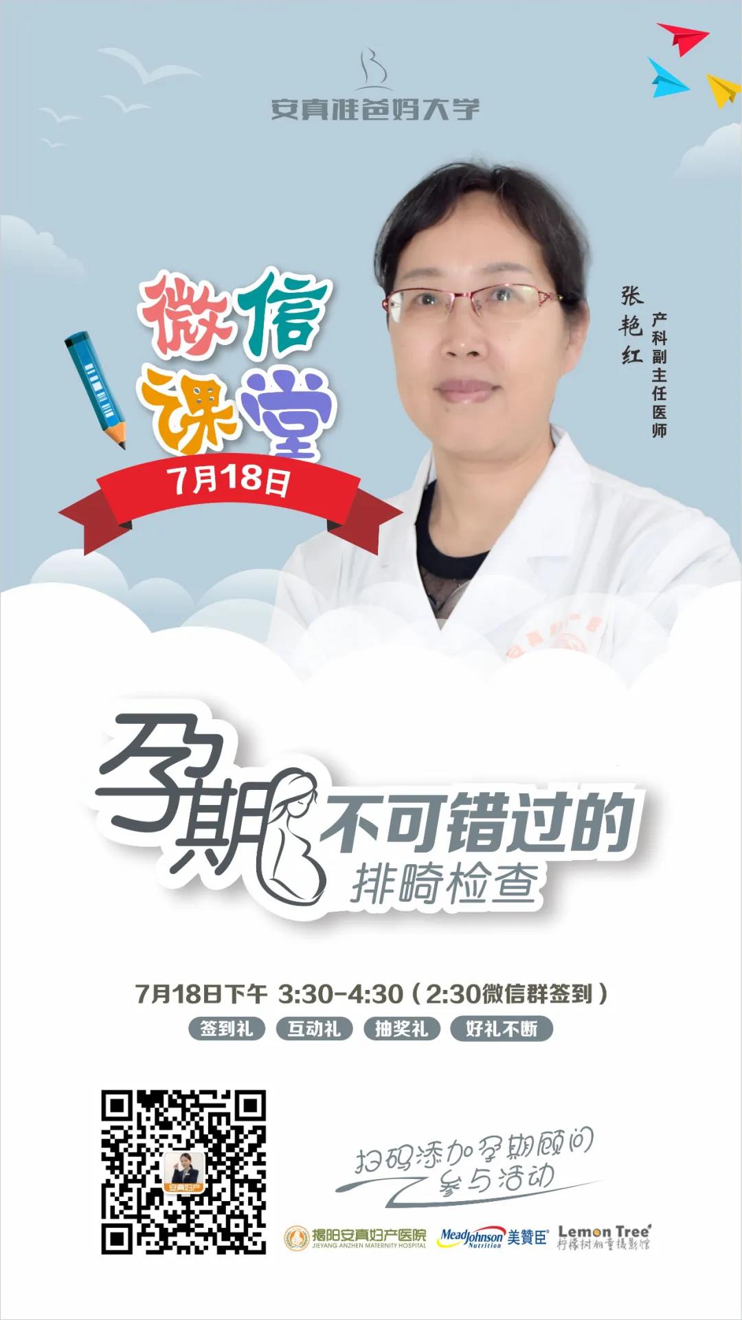 本周六(7月18日)下午3:30,安真准爸妈大学微信课堂,揭阳安真妇产医院产科副主任医师张艳红将与孕妈妈在线互动,详解孕期产检的重要知识,孕妈妈只要微信参与,即可与专家微信在线互动、抢手气红包、赢实物奖品!详情如下: